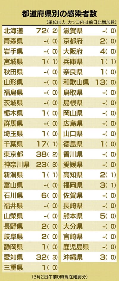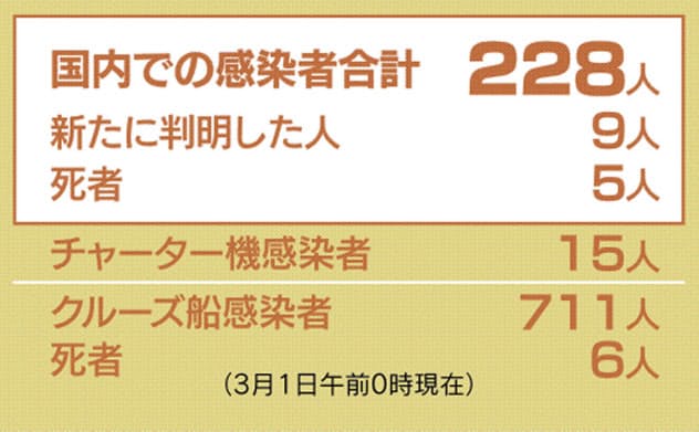 日本国内では、28日より北海道は「緊急事態宣言」を発表した。日本政府は専門家チームを発見し、北海道にマスクを配布するように指示をした。現時点、日本国内毎日10人前後増え、感染範囲は24都道府県に至った。