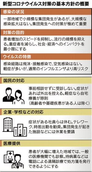 政府25日发表新的对策方案。为了避免集体感染,要求尽量避免不急不要的聚会。要求企业尽可能居家出勤,时差出勤。针对学校,教育委员会发放通令,如果发生感冒等呼吸道症状的生徒采取禁止出席等对策。在中也很有名的电通、资生堂也开始实行居家出勤的对策,将涉及到1万多人的规模。福冈市职员今天开始时差出勤,这些政策将实施到疫情稳定为止。